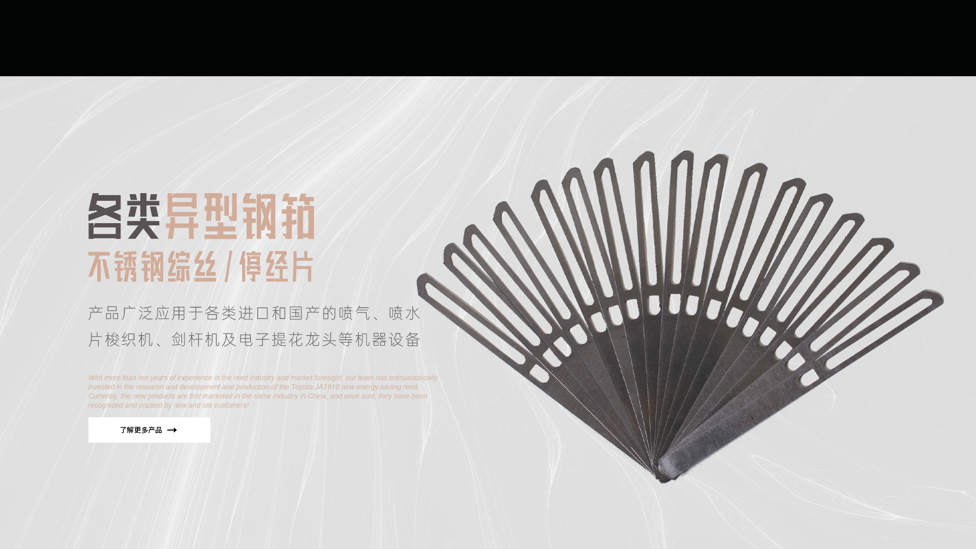 公司主要產(chǎn)品有:噴氣織機用各類異型鋼筘(傳統(tǒng)型豐田JAT710鋼筘及新研發(fā)的豐田JAT810節(jié)能筘);不銹鋼綜絲及不銹鋼停經(jīng)片。我們的產(chǎn)品廣泛應用于各類進口和國產(chǎn)的噴氣、噴水、片梭織機、劍桿機及電子提花龍頭等機器設備。